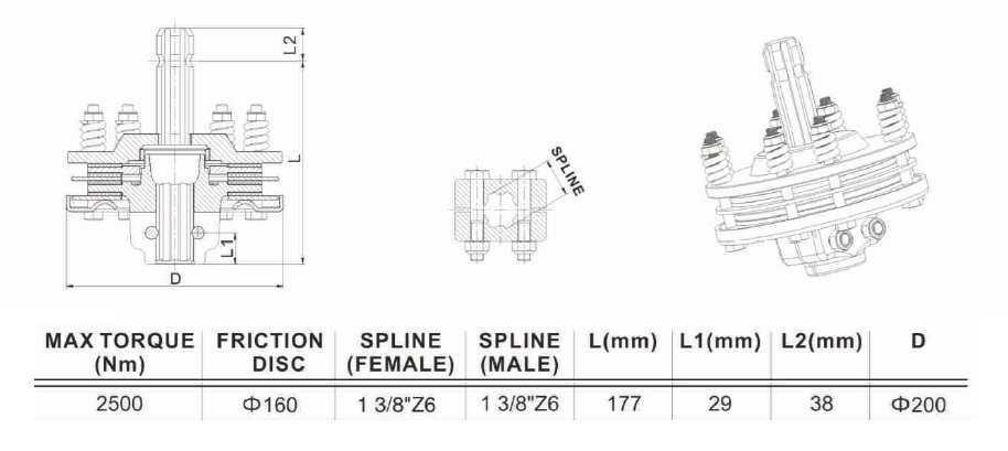 Универсальная фрикционная муфта втулка 6 шлицов (1 3/8 z-6) х вал 6 шлицов (1 3/8 z-6) (6х6) на 2500Нм.