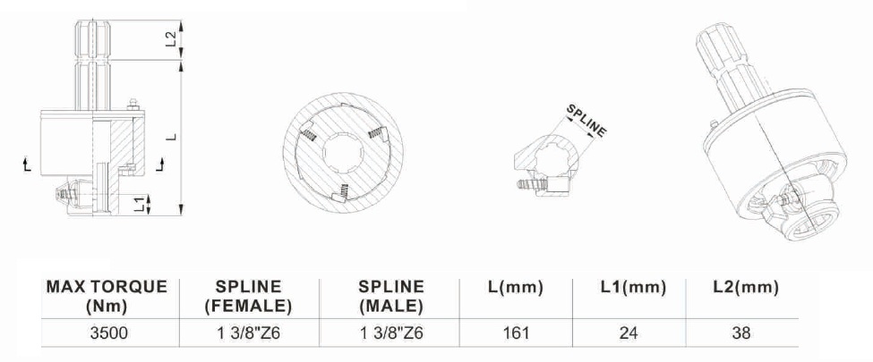 Универсальная обгонная муфта втулка 6 шлицов (1 3/8 z-6) х вал 6 шлицов (1 3/8 z-6) (6х6) на 3500Нм