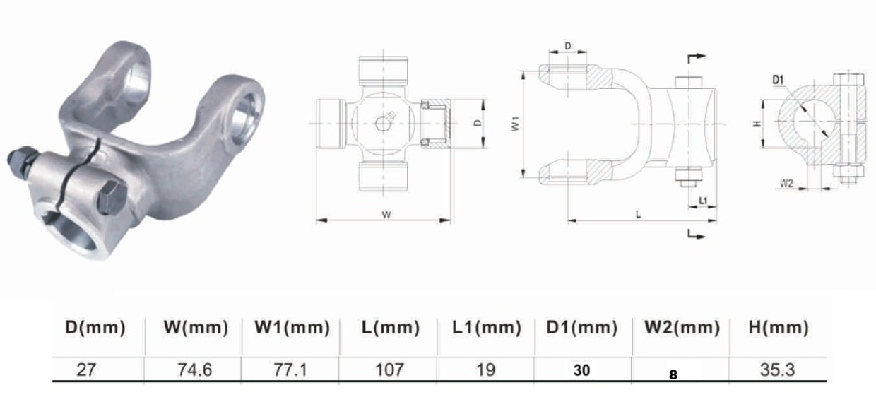 Вилка карданного вала 4-ой серии с цилиндрическим отверстием D=30мм под шпонку 8мм под крестовину 27х74,6, вилка является деталью карданного вала для сельскохозяйственной техники дорожных щеток, коммунальной техники и д.т.